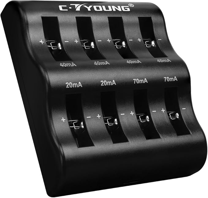 CTYOUNG Ladegerät für 3,6V Knopfzellen LIR2032 mit 8 Ladeschlitzen, 2025 - 20/40/70 mA, Ladekontrollleuchte, Sicherheitstechnik