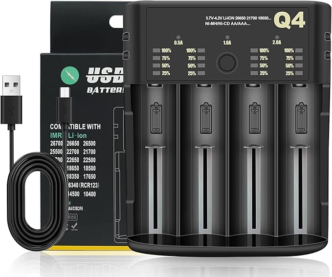 18650 Akku-Ladegerät mit 4 Steckplätzen, 3.6-4.2V Li-Ion Akku-Ladegerät, wiederaufladbar: 10440 16340 18650 18700 20700 21700 22650, 1.2-2.4 V Nimh/NiCd: AAAA, AAA, AA, a, a, SC, c